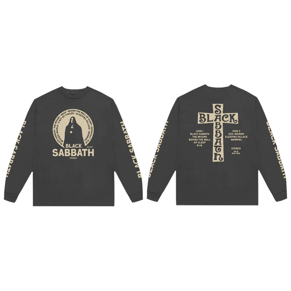 Self-Titled Track List Long Sleeve Shirt features iconic witch with circular logo on the front and tracklist cross on the back. Black Sabbath is printed down both sleeves.